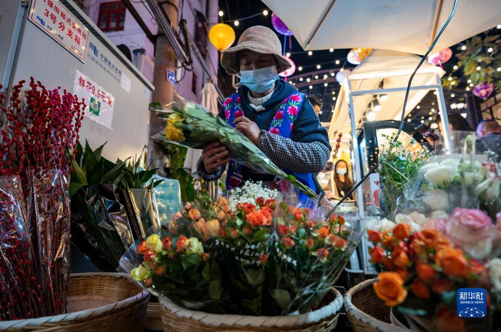 1月11日,一位售賣鮮花的攤主在打理鮮花。