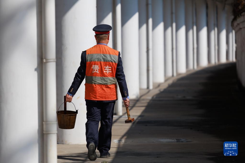 毛忠輝走過大田壩車站月臺去刷道岔油(1月11日攝)。