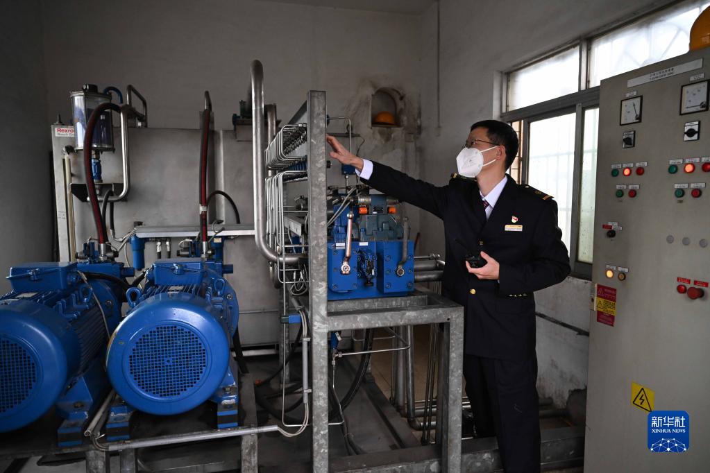 在廣東徐聞的粵海鐵路輪渡北港碼頭,熊美周在動力間檢查設備運行情況(1月8日攝)。
