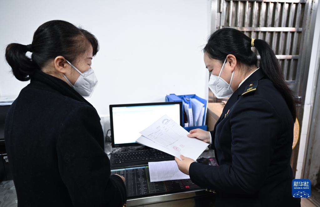 在??诘幕浐hF路輪渡南港碼頭售票處,伍琳(右)和同事交接業務(1月9日攝)。