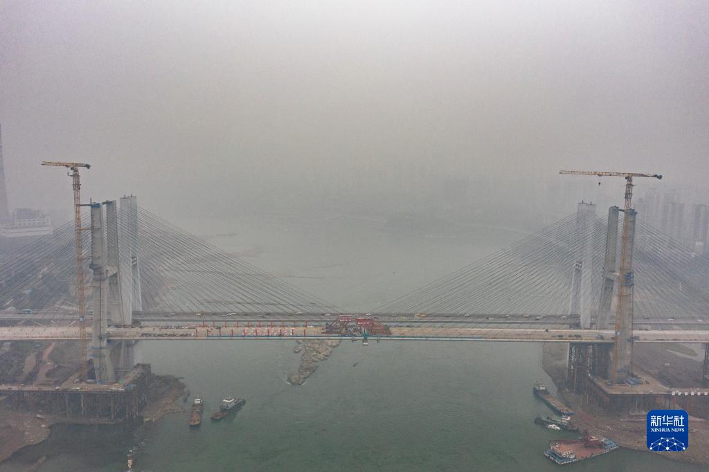這是李家沱長江復線橋合龍施工作業現場(1月12日攝,無人機照片)。