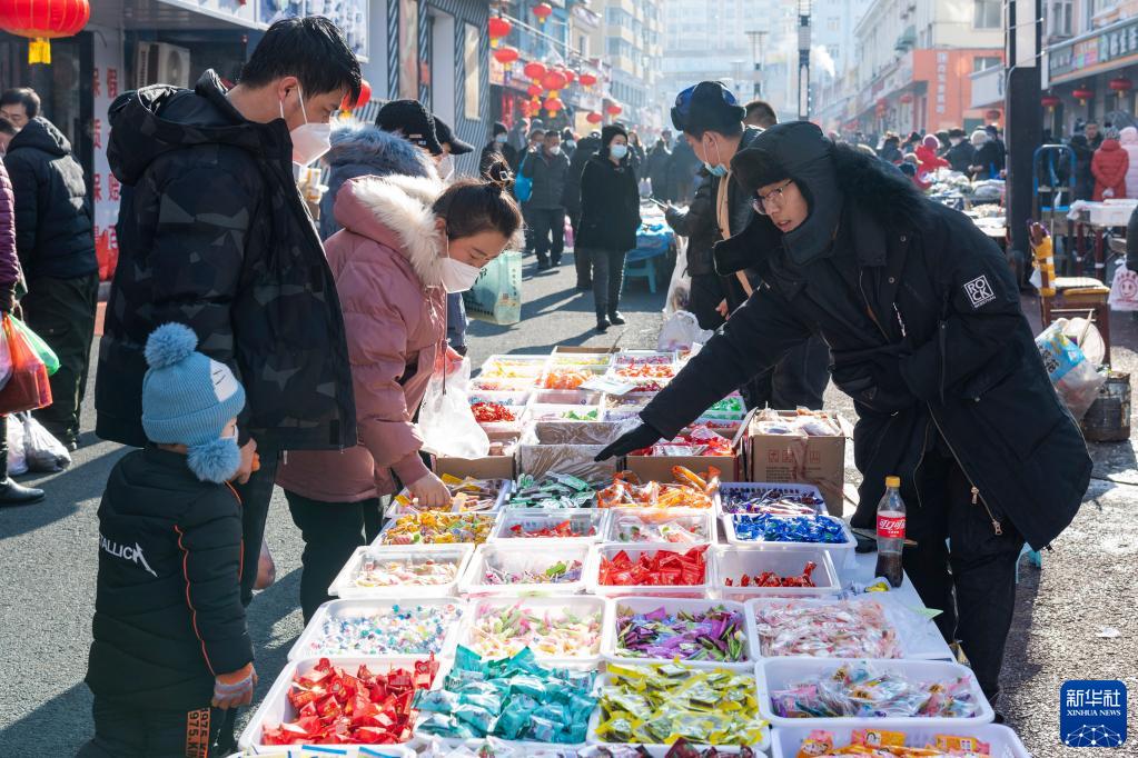 春節臨近,黑龍江省綏芬河市龍須溝步行街的年貨大集十分熱鬧。不少市民前來選購年貨,迎接新春的到來。