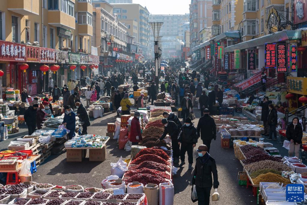 春節臨近,黑龍江省綏芬河市龍須溝步行街的年貨大集十分熱鬧。不少市民前來選購年貨,迎接新春的到來。