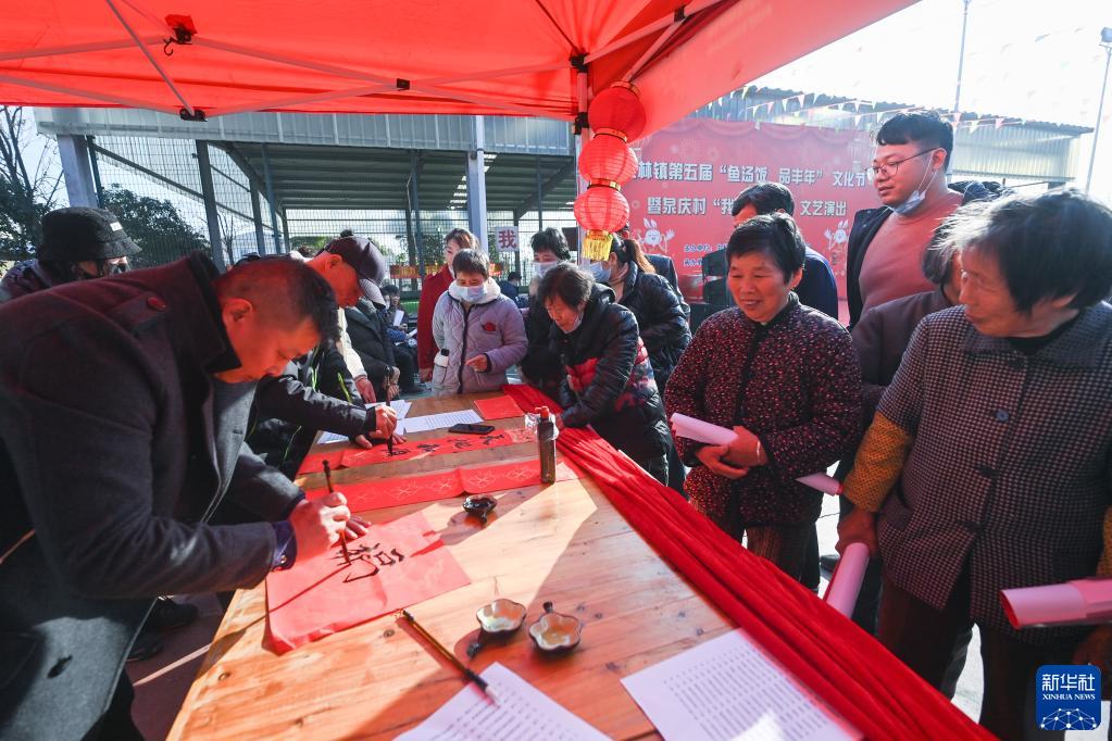 當日,浙江省湖州市吳興區東林鎮的水鄉“魚湯飯 品豐年”迎春活動在泉慶村舉辦,活動包括清塘捕魚,魚湯飯、魚圓魚餅、刺毛圓子、手作年糕等年味美食的制作及品嘗,還有歌舞表演、非遺柳編現場展示、書法愛好者寫春聯送祝福等。