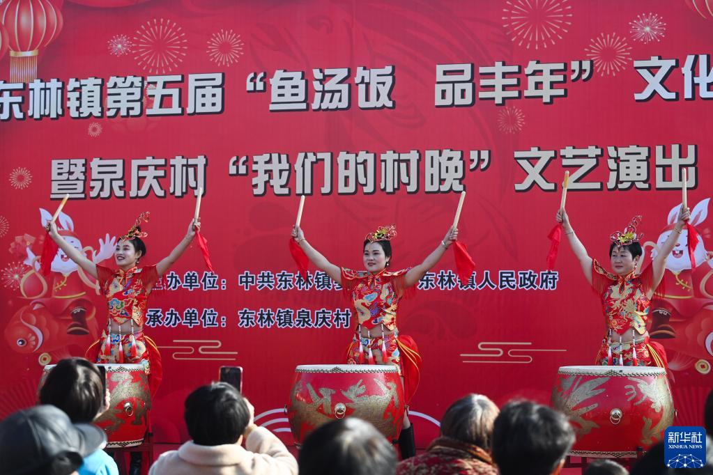當日,浙江省湖州市吳興區東林鎮的水鄉“魚湯飯 品豐年”迎春活動在泉慶村舉辦,活動包括清塘捕魚,魚湯飯、魚圓魚餅、刺毛圓子、手作年糕等年味美食的制作及品嘗,還有歌舞表演、非遺柳編現場展示、書法愛好者寫春聯送祝福等。