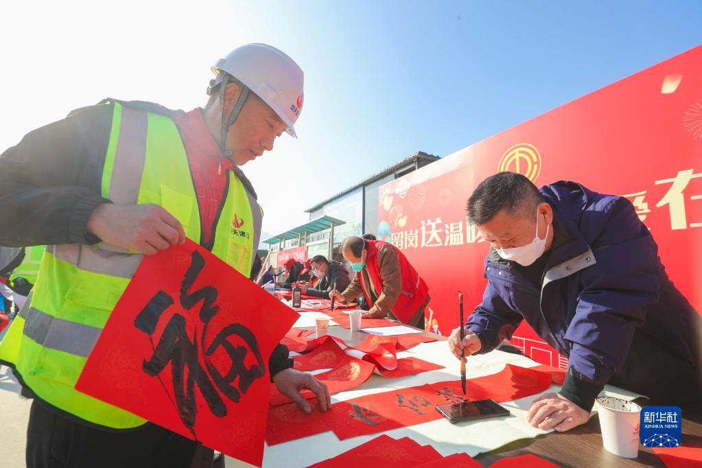 1月12日,在浙江省湖州市德清縣一處建設工地,書法愛好者為工友寫春聯和福字。