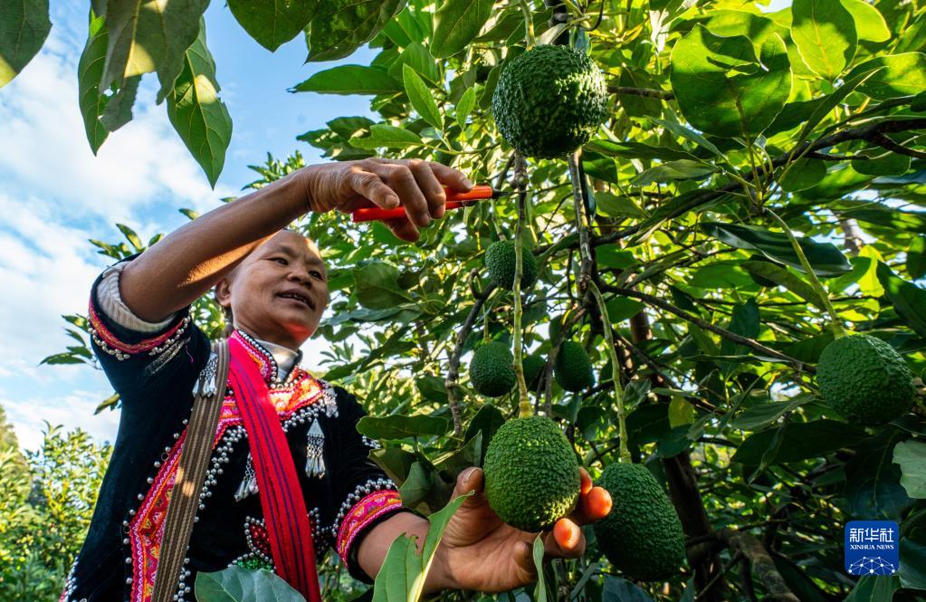 云南省孟連縣農戶在采摘牛油果(2022年11月17日攝)。
