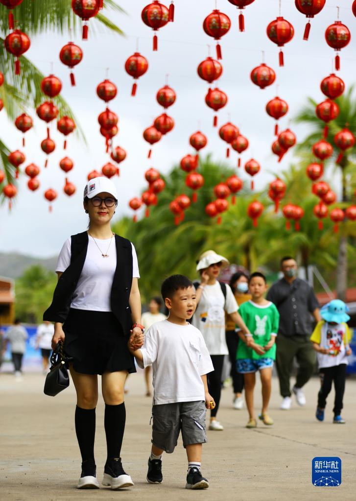 1月12日,家長帶著孩子在海南省三亞南山文化旅游區游覽。