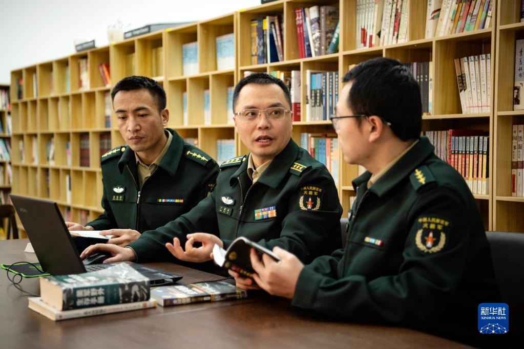 火箭軍某部處長丁國林(中)與骨干一起研究對抗訓練問題(資料照片)。