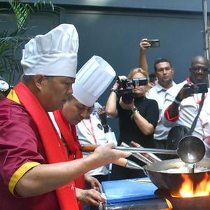 1月12日,在古巴首都哈瓦那,中國廚師(左)在2023年古巴國際美食節上展示廚藝。