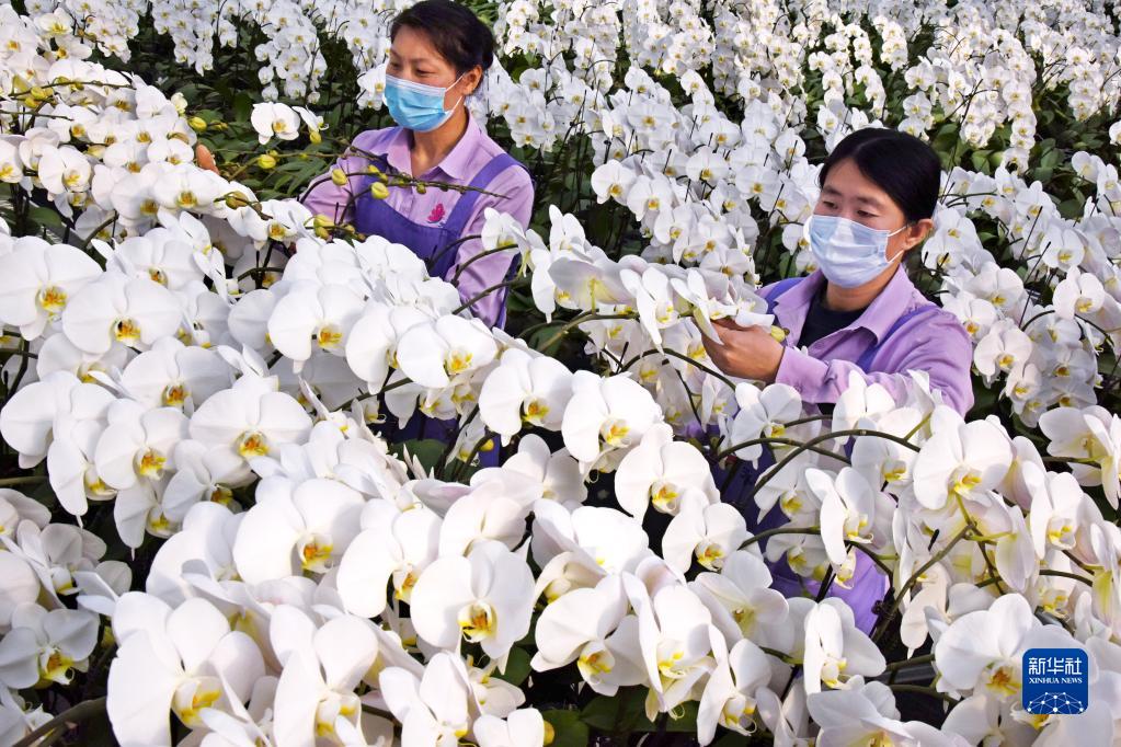 近日,山東省平度市舊店鎮花卉種植基地50萬株蝴蝶蘭進入盛花期,花工們忙碌著整理打包花卉,供應節日市場。