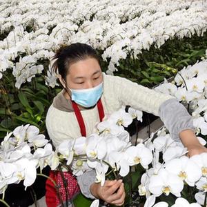 1月11日,在平度市舊店鎮一花卉種植基地內,花工在整理蝴蝶蘭。