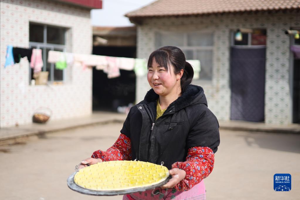 1月11日,元古堆村的村民端著面餅準備制作烤饃。