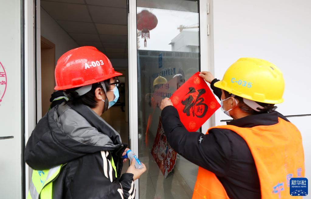 1月13日,工友在談家橋項目工地辦公室門上貼福字。