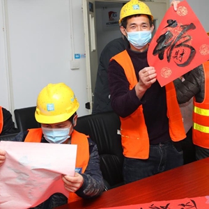 當日,在中建二局華東公司上海談家橋項目工地,來自談家橋社區的書法愛好者為工人師傅們現場寫春聯和福字,送上春節祝福。