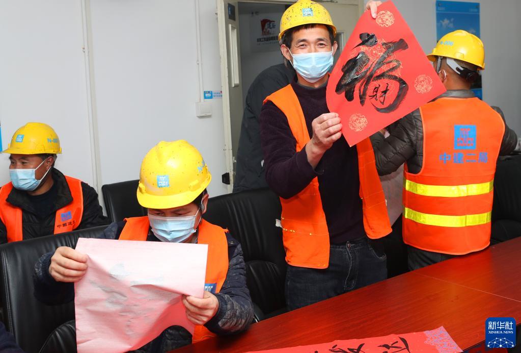 當日,在中建二局華東公司上海談家橋項目工地,來自談家橋社區的書法愛好者為工人師傅們現場寫春聯和福字,送上春節祝福。