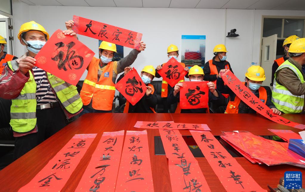 當日,在中建二局華東公司上海談家橋項目工地,來自談家橋社區的書法愛好者為工人師傅們現場寫春聯和福字,送上春節祝福。