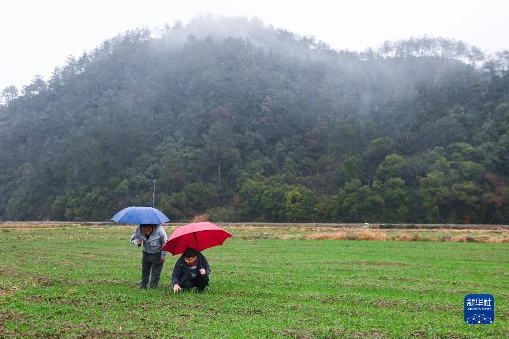 1月13日,在浙江省杭州市臨安區太湖源鎮青云村,吳旭東(右)和創業伙伴吳斌在地里查看小麥的長勢。1987年出生的吳旭東是杭州億谷農業科技有限責任公司的負責人,2022年回到自己家鄉承包了1500多畝土地發展現代農業。