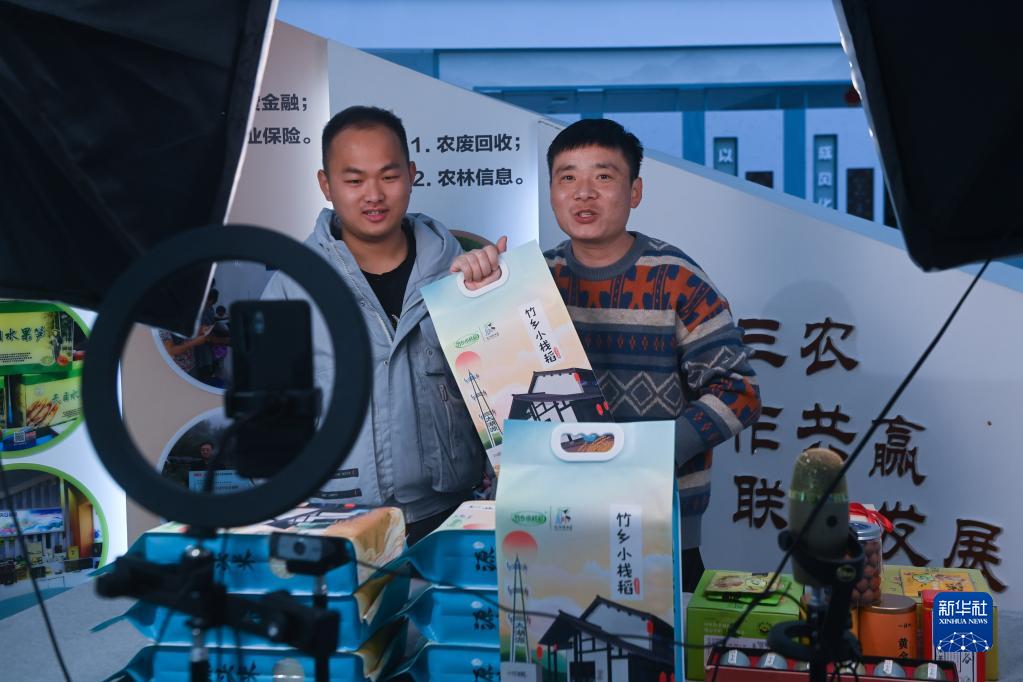 1月13日,在太湖源鎮黨群服務中心的直播間,吳旭東(右)和創業伙伴吳斌一起吆喝自己種植的大米。
