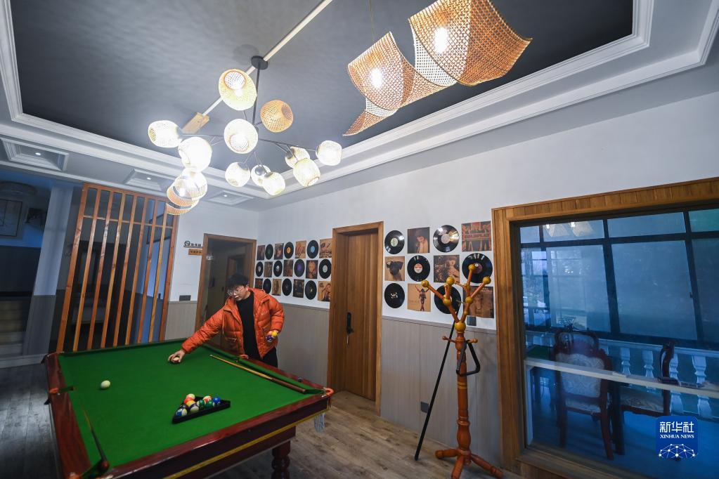 1月13日,在浙江省杭州市臨安區太湖源鎮橫徐村,呂康在自己開辦的民宿里整理臺球桌。