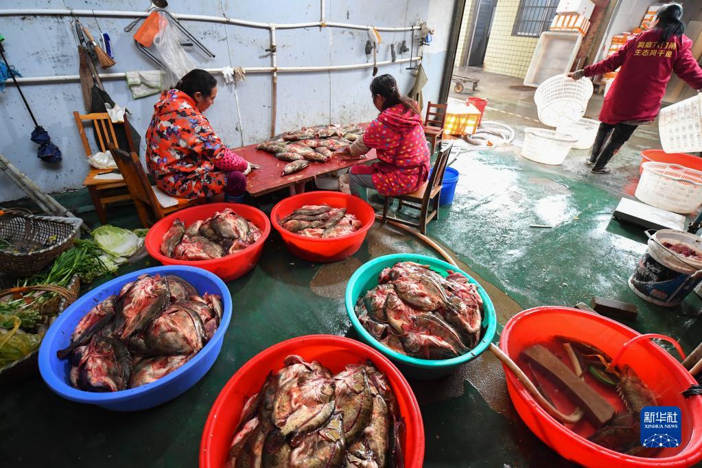 在岳陽市君山區錢糧湖鎮六門閘社區生態漁村,居民在剖魚(1月12日攝)。