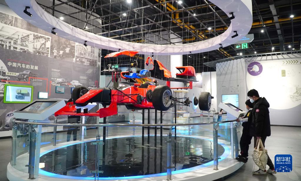 1月13日,在山東省科技館新館,參觀者在了解汽車結構有關的知識。
