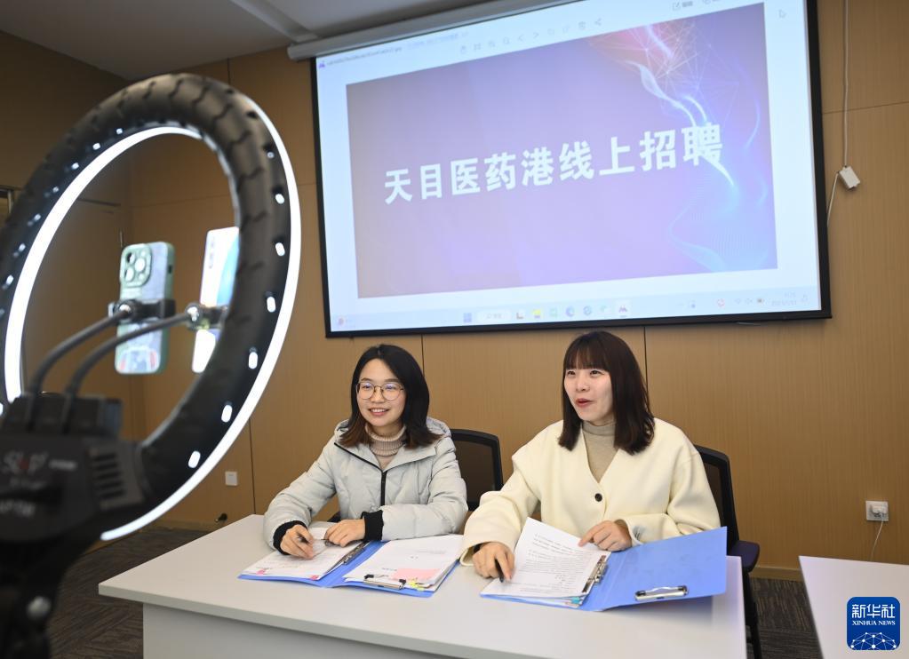 1月13日,在天目醫藥港醫藥產業孵化園的線上招聘會直播間,錦南新城管委會負責人和主持人一起介紹孵化園以及園內企業的人才需求。
