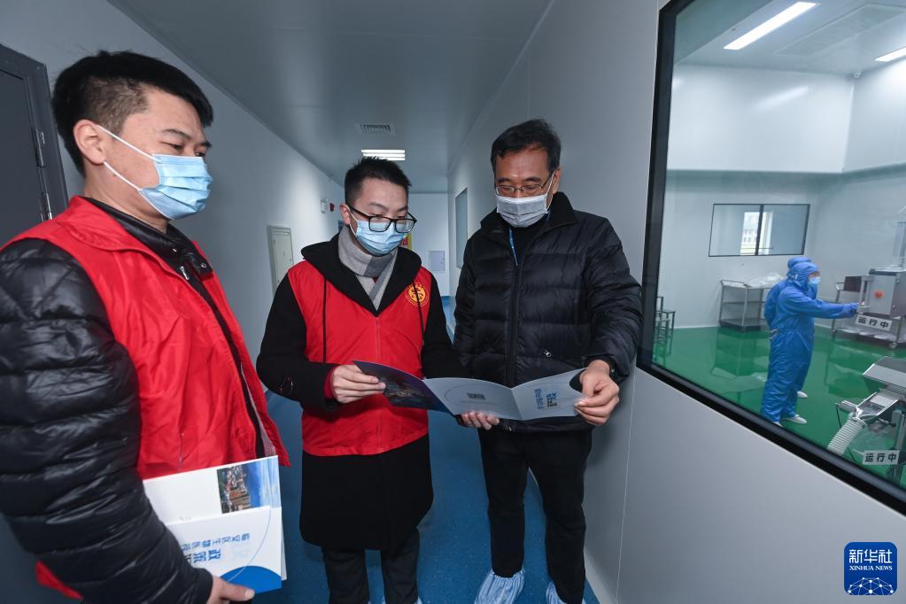 1月13日,在位于杭州市臨安區錦南新城的浙江大冢制藥有限公司內,錦南新城管委會“助企紓困”小分隊的黨員志愿者在給企業負責人(右一)講解惠企政策。