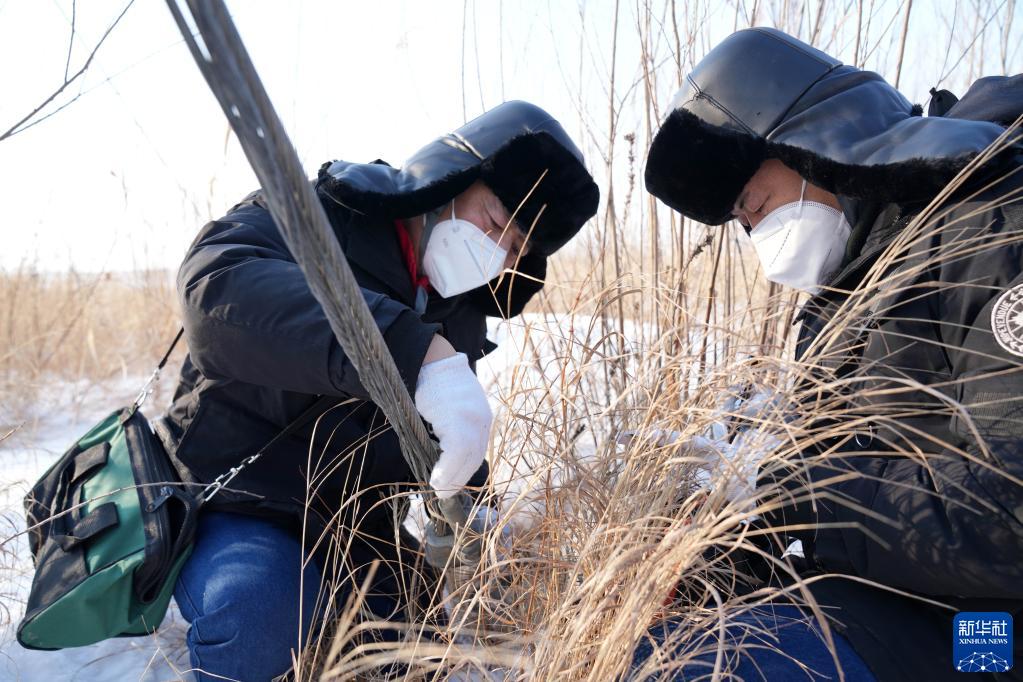 1月12日,國網撫遠市供電分公司抓吉供電所所長白樺先(左)和工友費義偉在巡視東極線。