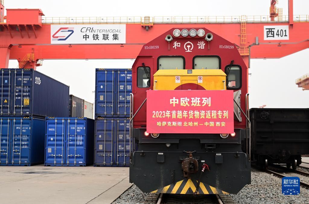 1月13日上午,滿載來自哈薩克斯坦1300噸面粉的中歐班列駛入西安國際港站貨場,標志著2023年首趟中歐班列年貨物資返程專列順利抵達西安,為即將到來的春節拉來了“洋年貨”。