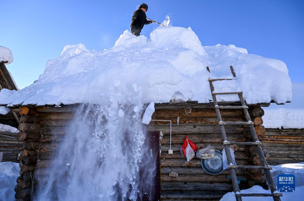 新疆阿勒泰地區禾木村村民木拉提·哈森張在清理小木屋頂積雪(1月12日攝)。他已將自家的10間房屋租給景區商戶開辦民宿。