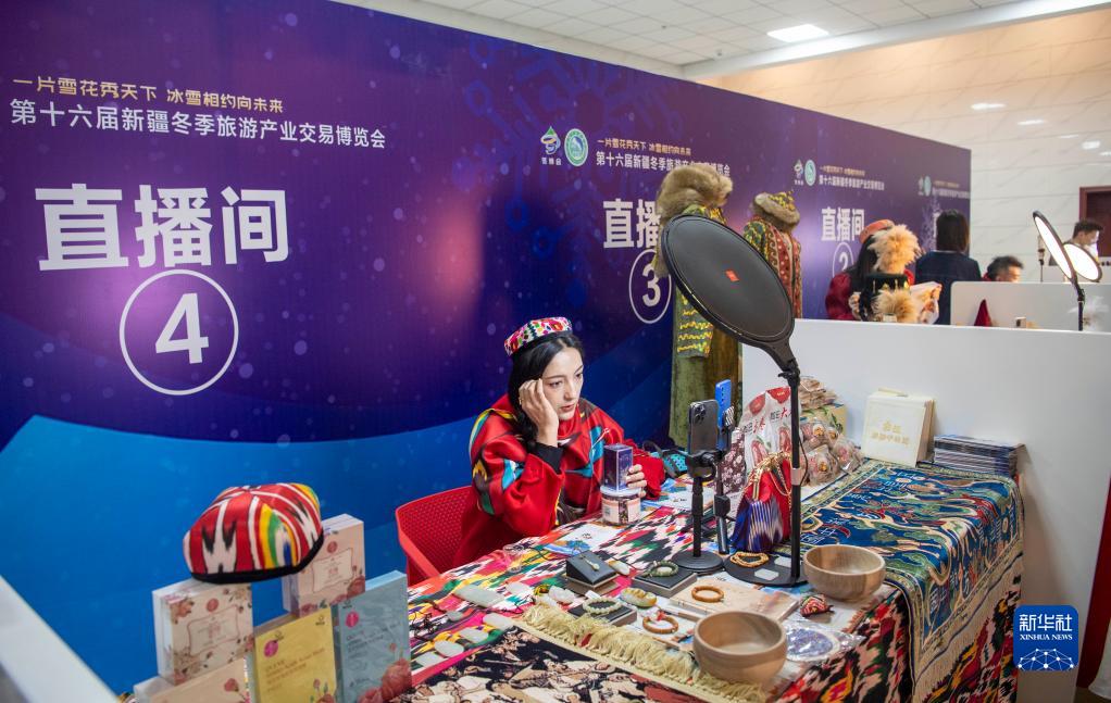第十六屆新疆冬季旅游產業交易博覽會在阿勒泰市舉辦,主播在直播間介紹特色文旅產品(2022年12月30日攝)。