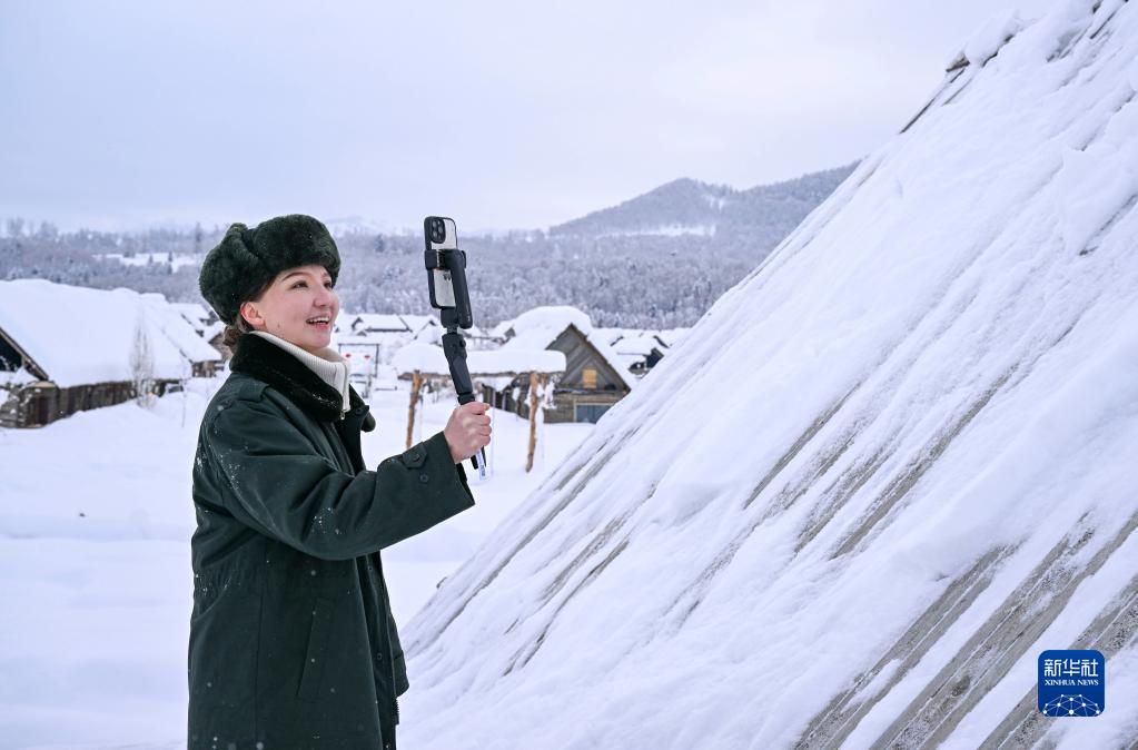 新疆阿勒泰地區禾木景區民宿經營戶米娜通過網絡直播介紹家鄉雪景(1月7日攝)。她說,近年來,禾木吉克普林滑雪場冬季游客明顯增多。