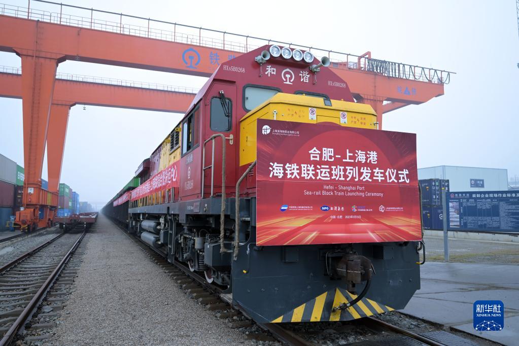 1月13日,在合肥北站物流基地,2023年合肥開往上海的首趟海鐵聯運班列即將發車。