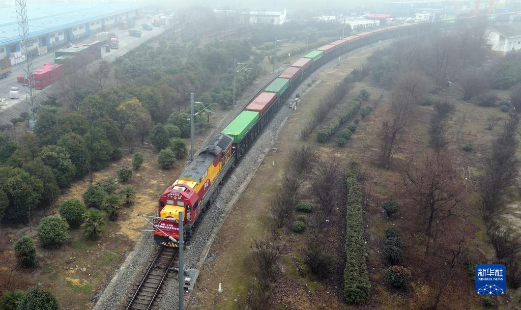 1月13日,2023年合肥開往上海的首趟海鐵聯運班列從合肥北站物流基地駛出(無人機照片)。