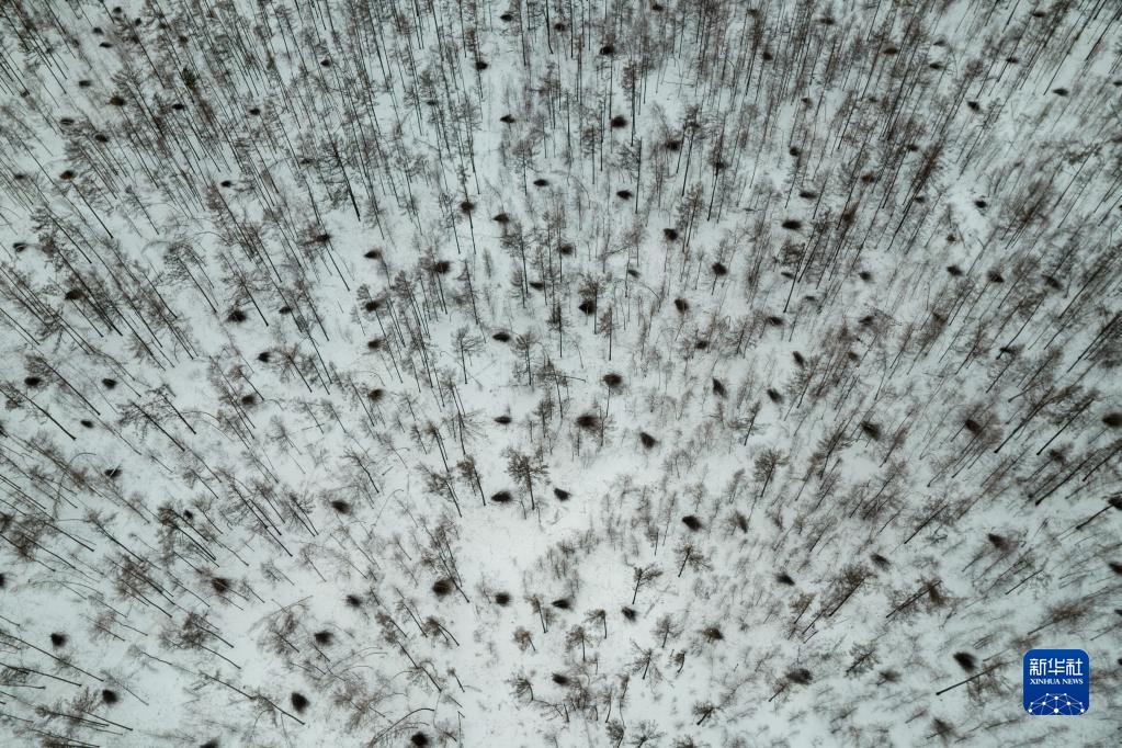 這是1月11日拍攝的漠河林場撫育作業點已經完成林間清理作業的樹枝堆(無人機照片)。