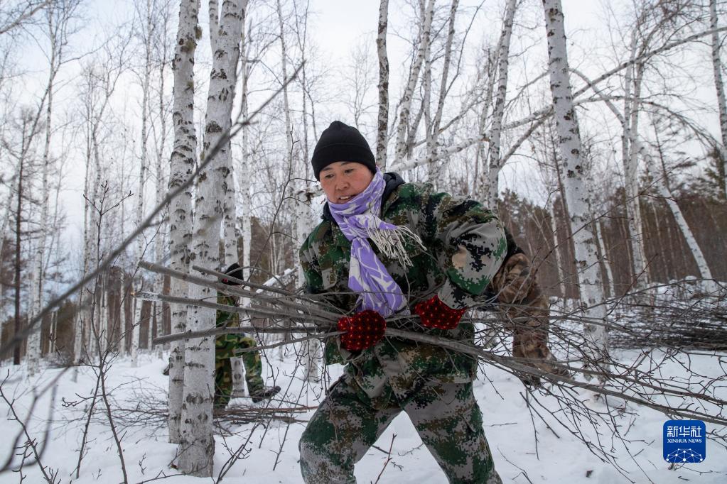 1月11日,在漠河林場管護區作業點,森林撫育工人閆秀艷在進行林間清理作業。