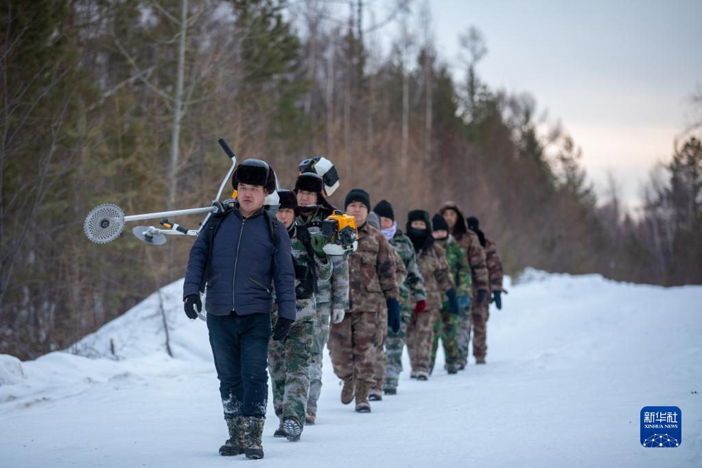 1月11日,在漠河林場管護區作業點,森林撫育工人在返回臨時帳篷途中。