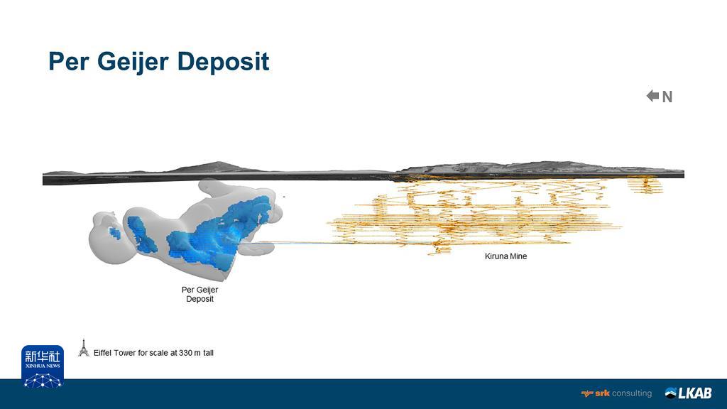 由盧奧薩山-基呂納山公司提供的示意圖顯示的是,該公司在瑞典北部城市基律納鐵礦附近發現的歐洲地區已知最大規模的稀土礦床(藍色)。