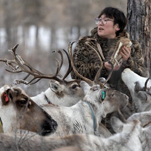 這個39歲的敖魯古雅鄂溫克人此時正穿著祖上流傳下來的獸皮衣,在茫茫林海雪原中尋覓、呼喚自己的馴鹿群。每叫喊完一聲,他就會站住靜靜地傾聽一會兒。如果附近的鹿群聽到這呼喚聲,它們便會行動起來,脖子上掛著的鹿鈴就會響起,對覺樂來說,那鹿鈴聲仿佛天籟般動聽。