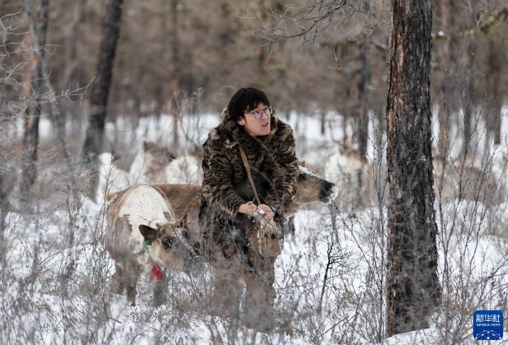 1月12日,覺樂用雪洗手,消除手上的異味,準備給鹿群喂一些豆餅。馴鹿對氣味非常敏感。新華社記者 費茂華 攝