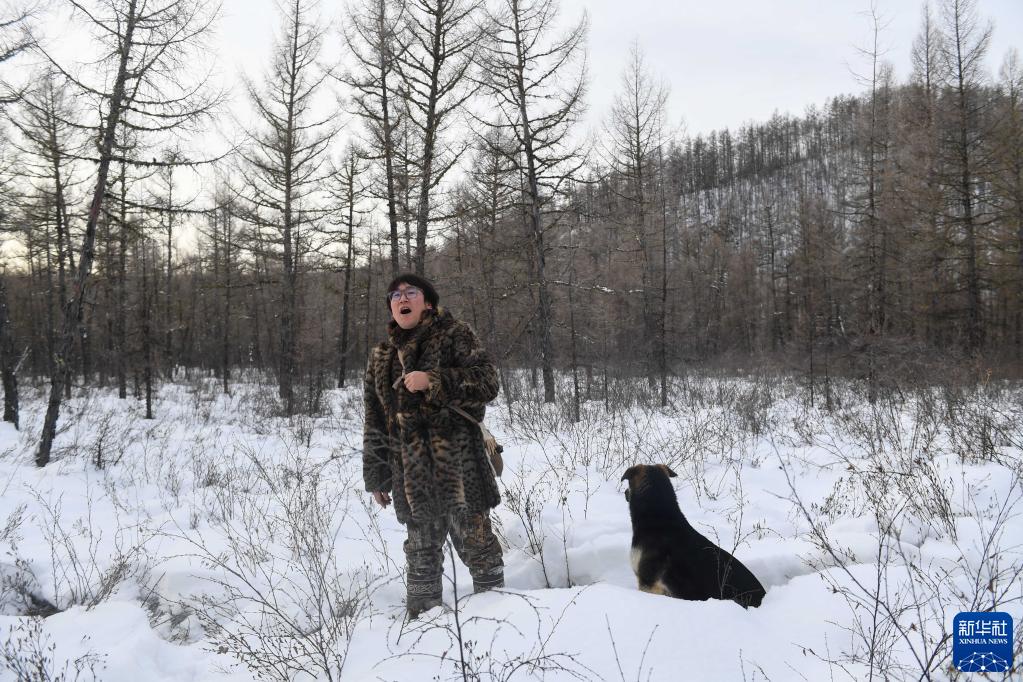 1月12日,覺樂在山林中呼喚自己的鹿群。新華社記者 彭源 攝