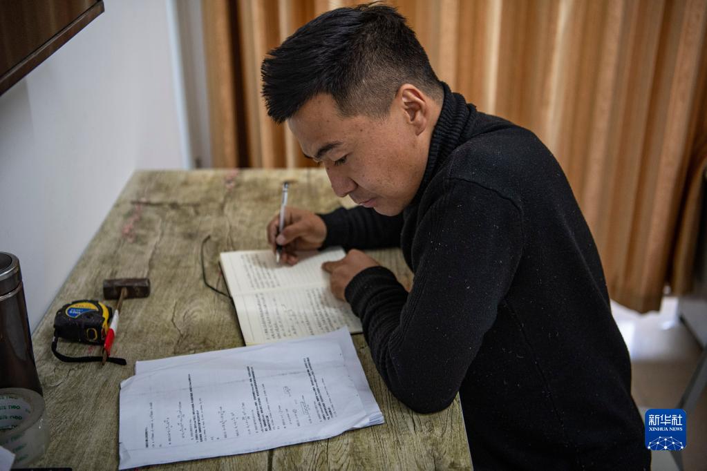 在拉林鐵路扎囊工電綜合工區的宿舍里,羅布在進行業務學習(1月12日攝)。