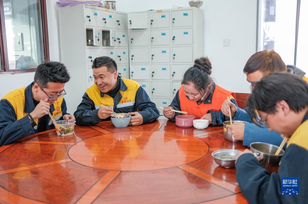 在拉林鐵路扎囊工電綜合工區,羅布(左二)和同事一起吃晚飯(1月12日攝)。