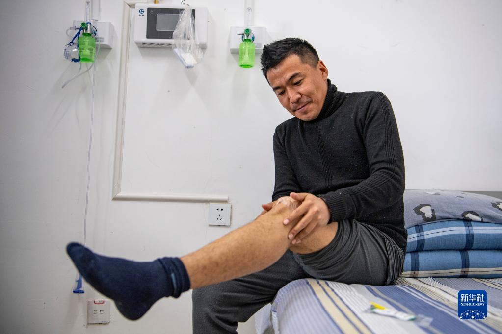 在拉林鐵路扎囊工電綜合工區的宿舍里,羅布給膝蓋貼膏藥。常年徒步進行鋼軌探傷,羅布落下了膝關節半月板損傷的病癥(1月12日攝)。
