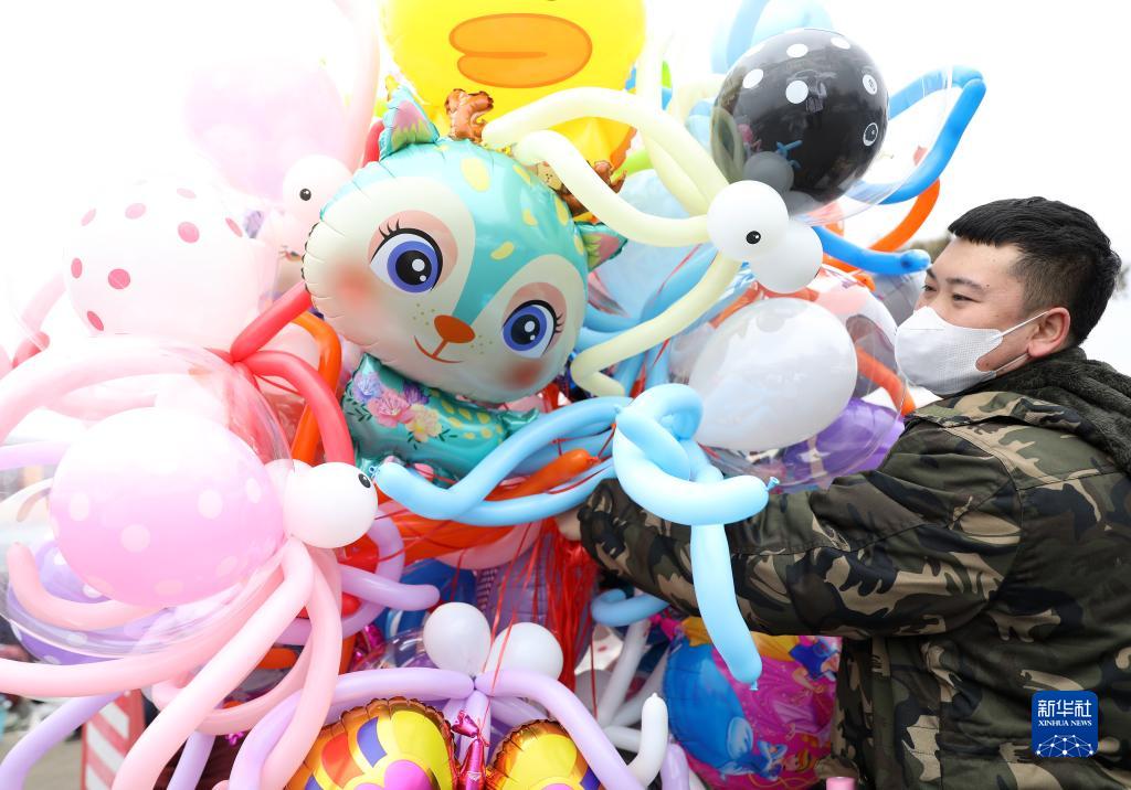 1月12日,一名攤主在蒲河大集上售賣氣球。