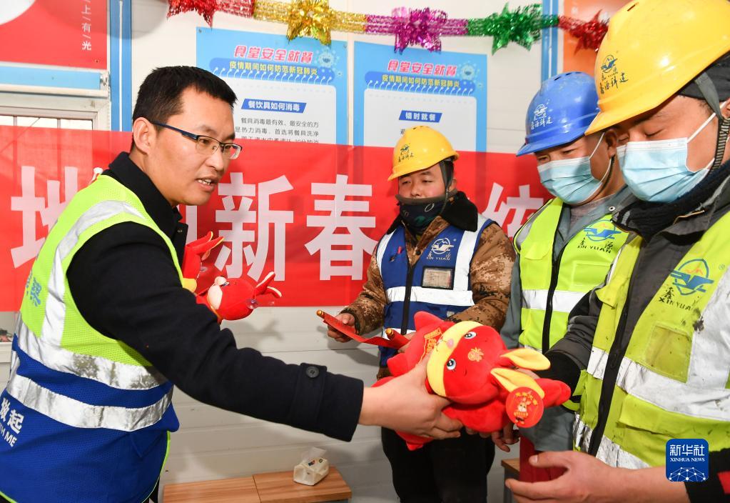 1月13日,在位于陜西省西安市的陜西師范大學體育訓練中心建設項目現場,中建三局西北公司項目管理人員(左)向工人發放兔年紀念品。