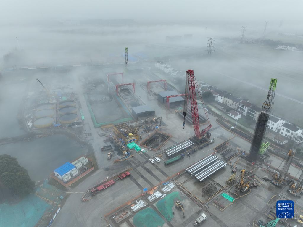 1月13日拍攝的張靖皋長江大橋南航道橋南錨碇施工現場(無人機照片)。