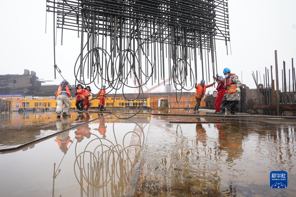 1月13日,工人在張靖皋長江大橋南航道橋南錨碇施工現場作業。