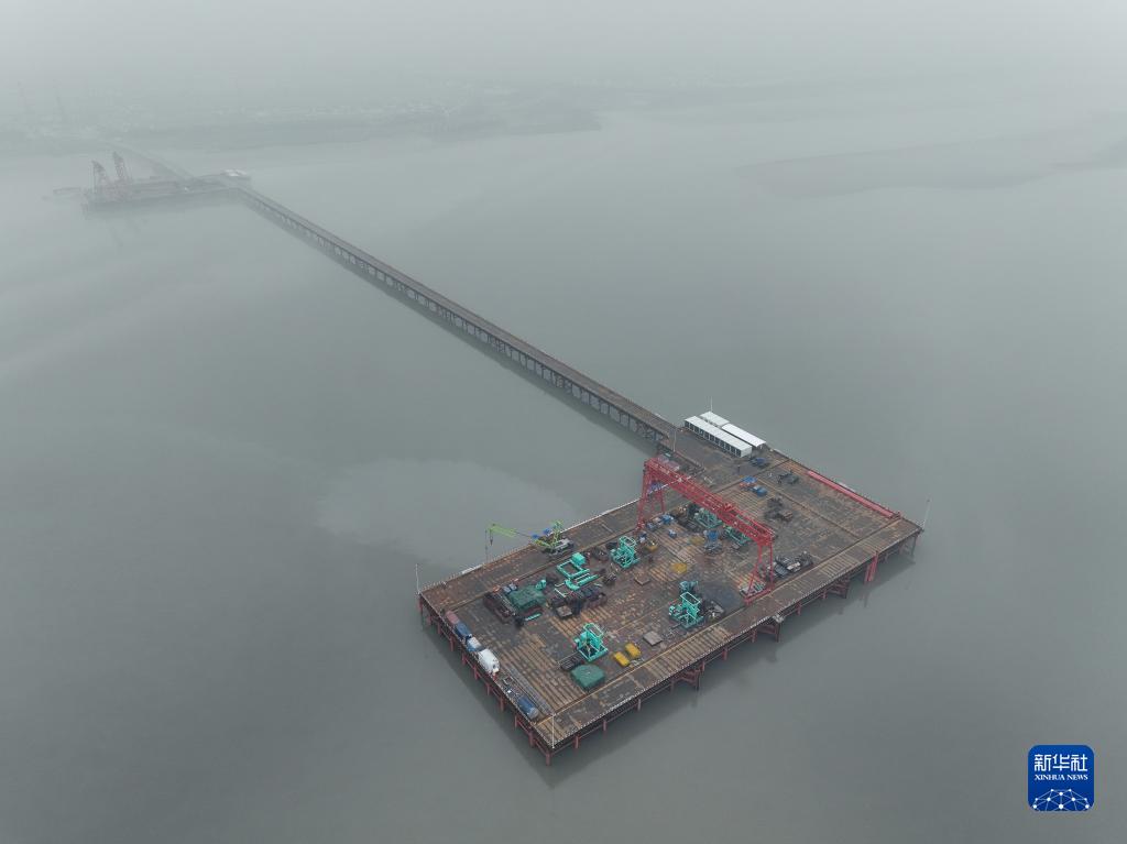 1月13日拍攝的張靖皋長江大橋南航道橋南主塔施工現場(無人機照片)。